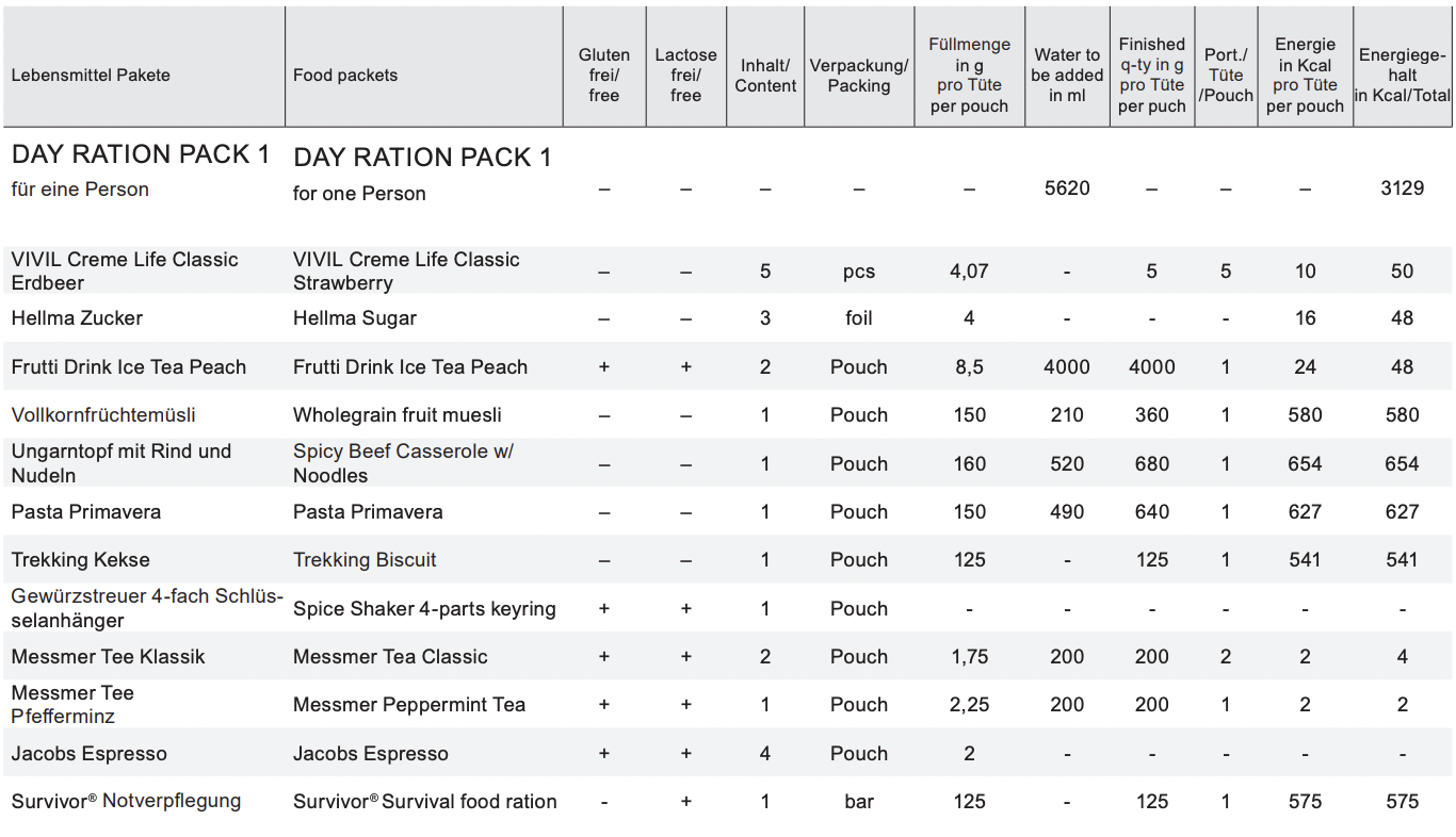 Het Day Ration Pack is een compleet voedselpakket, speciaal samengesteld voor één persoon voor één volledige dag. Ideaal voor noodsituaties, outdoor-avonturen, meerdaagse trektochten of als onderdeel van je noodvoorraad.